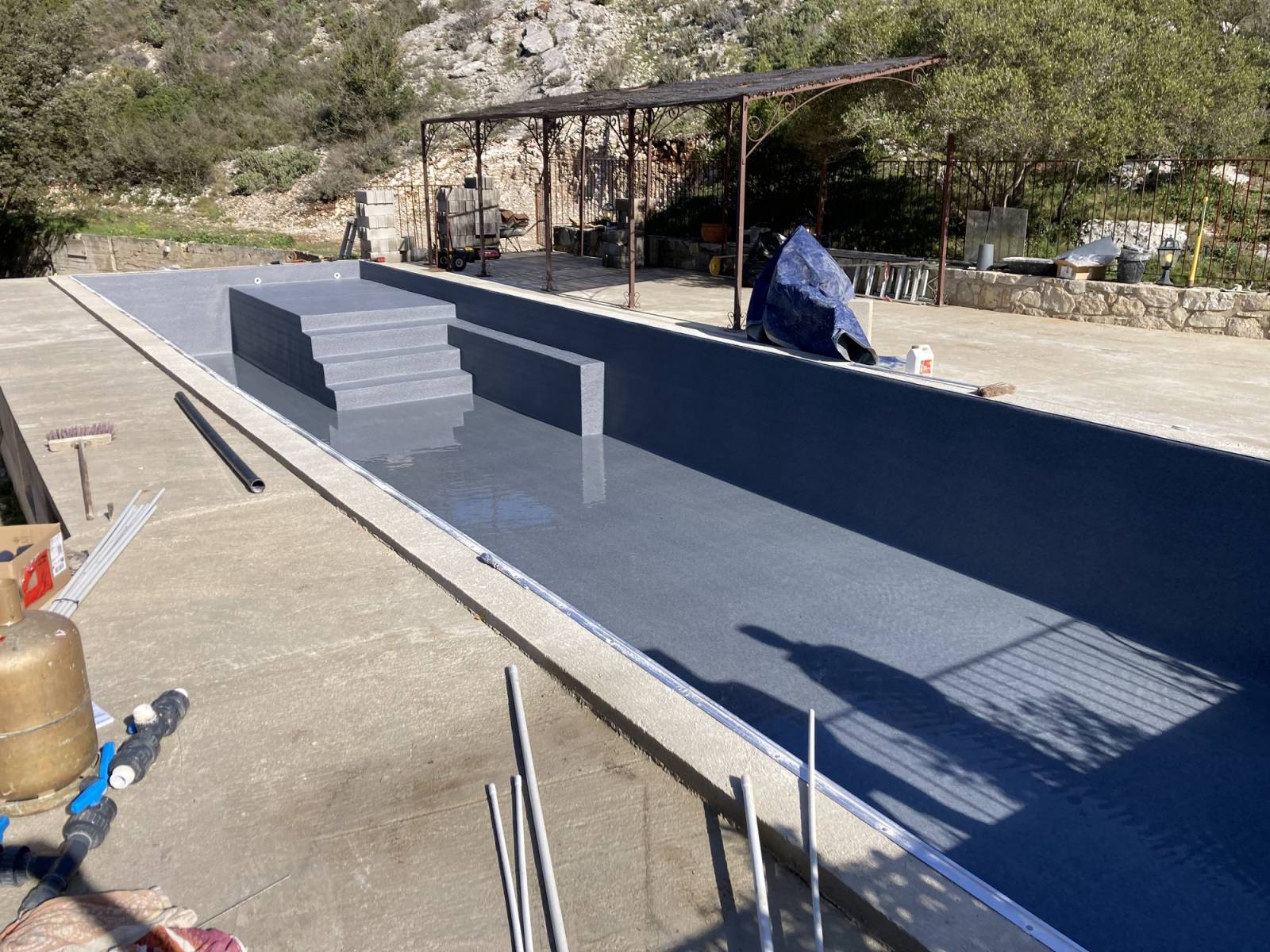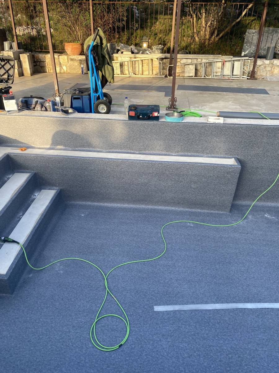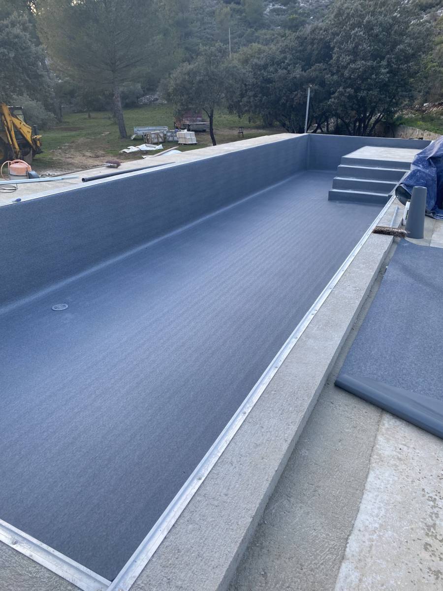 L'équipe expérimentée de LJS Piscines a soigneusement préparé la surface existante avant d'appliquer le revêtement PVC armé, assurant une finition impeccable.